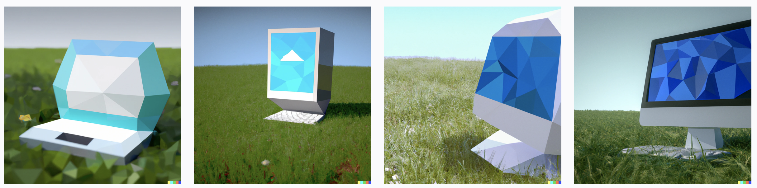 接下来,我想要生成同样风格的一台电脑: Low poly white and blue computer sitting in a sparse green meadow