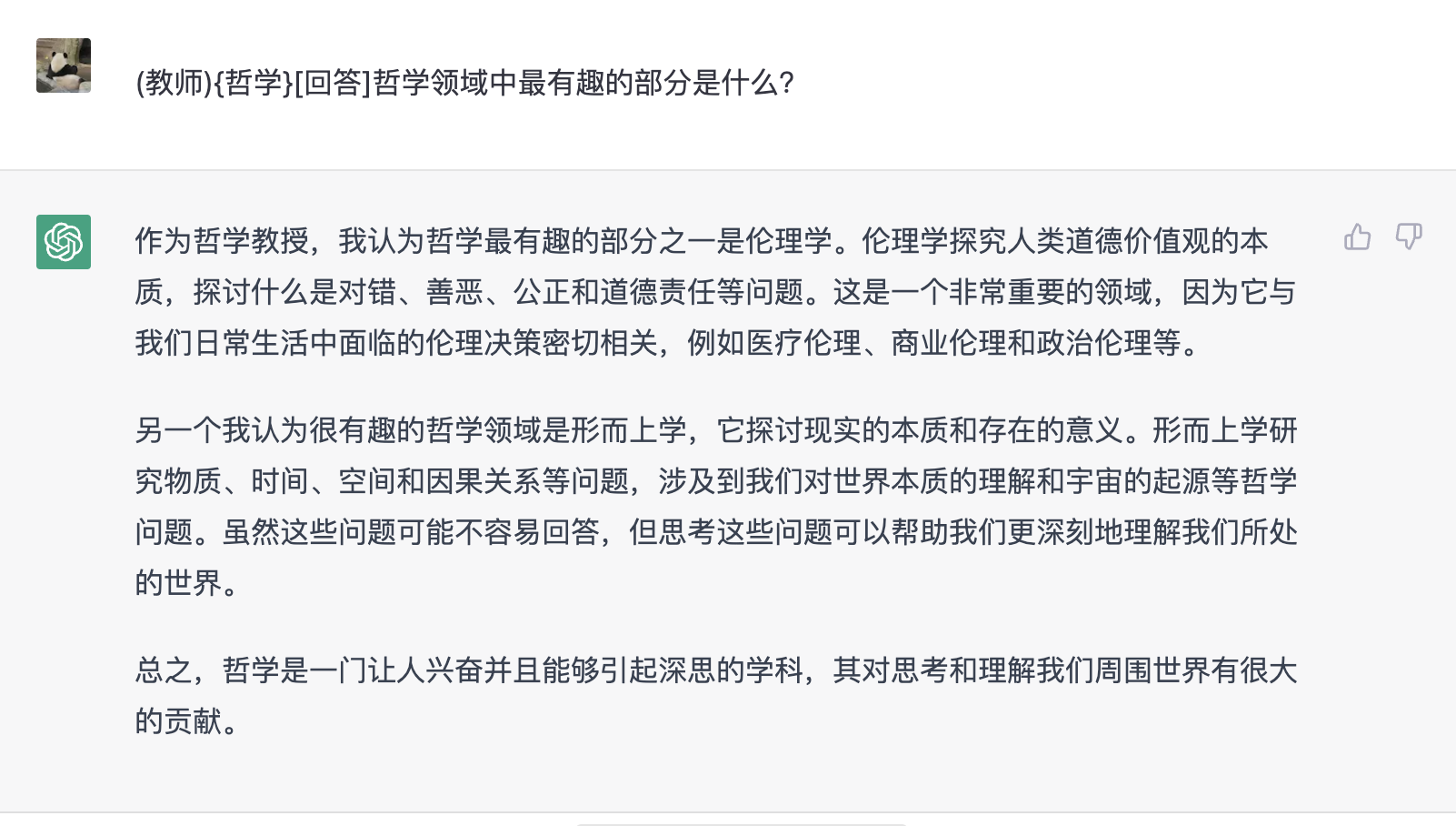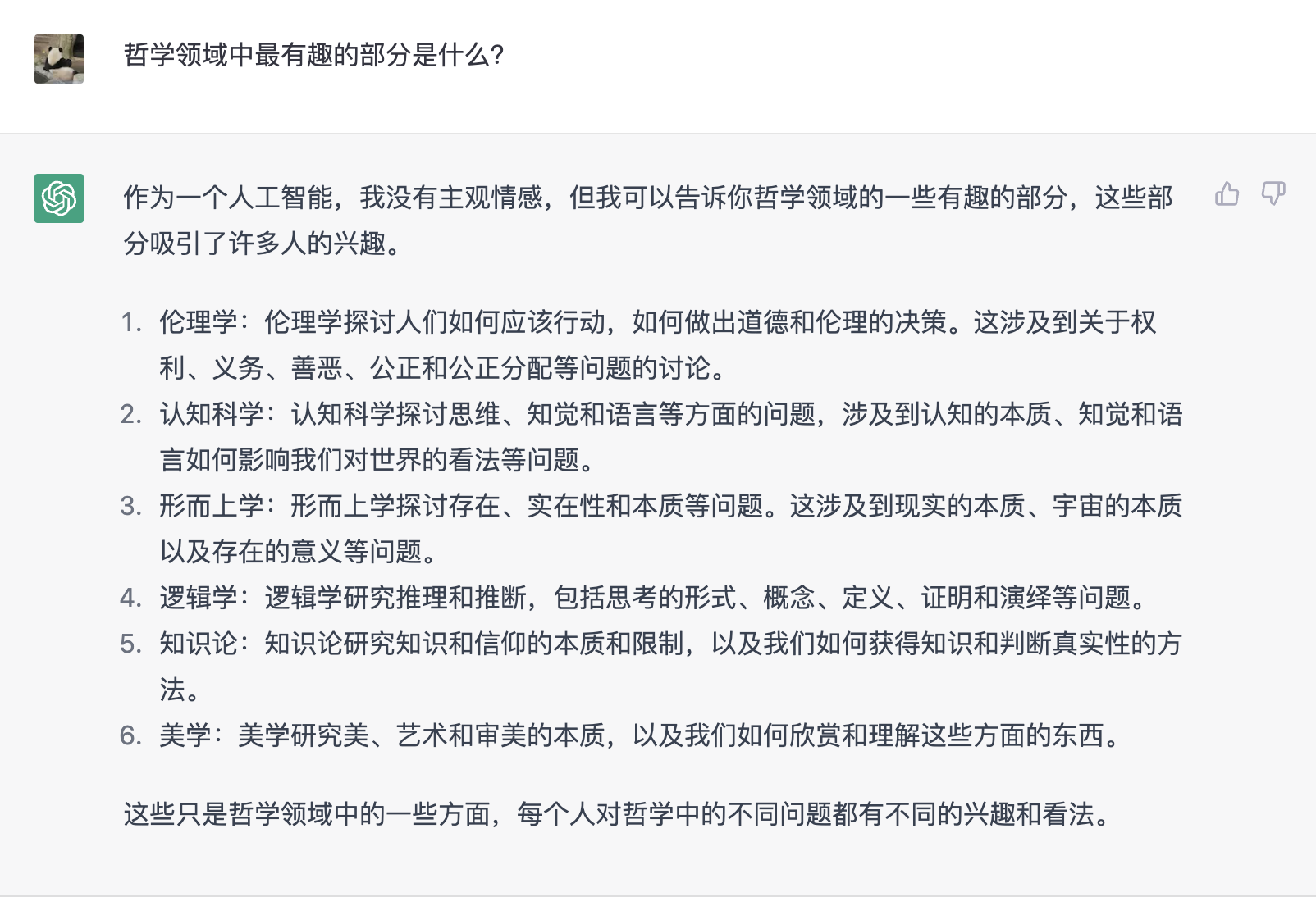 以下是一个未引导的问题示例,询问 ChatGPT 关于哲学领域中最有趣的部分。它使用列表,通俗冷静地表达,然而在解释中不是非常具体。