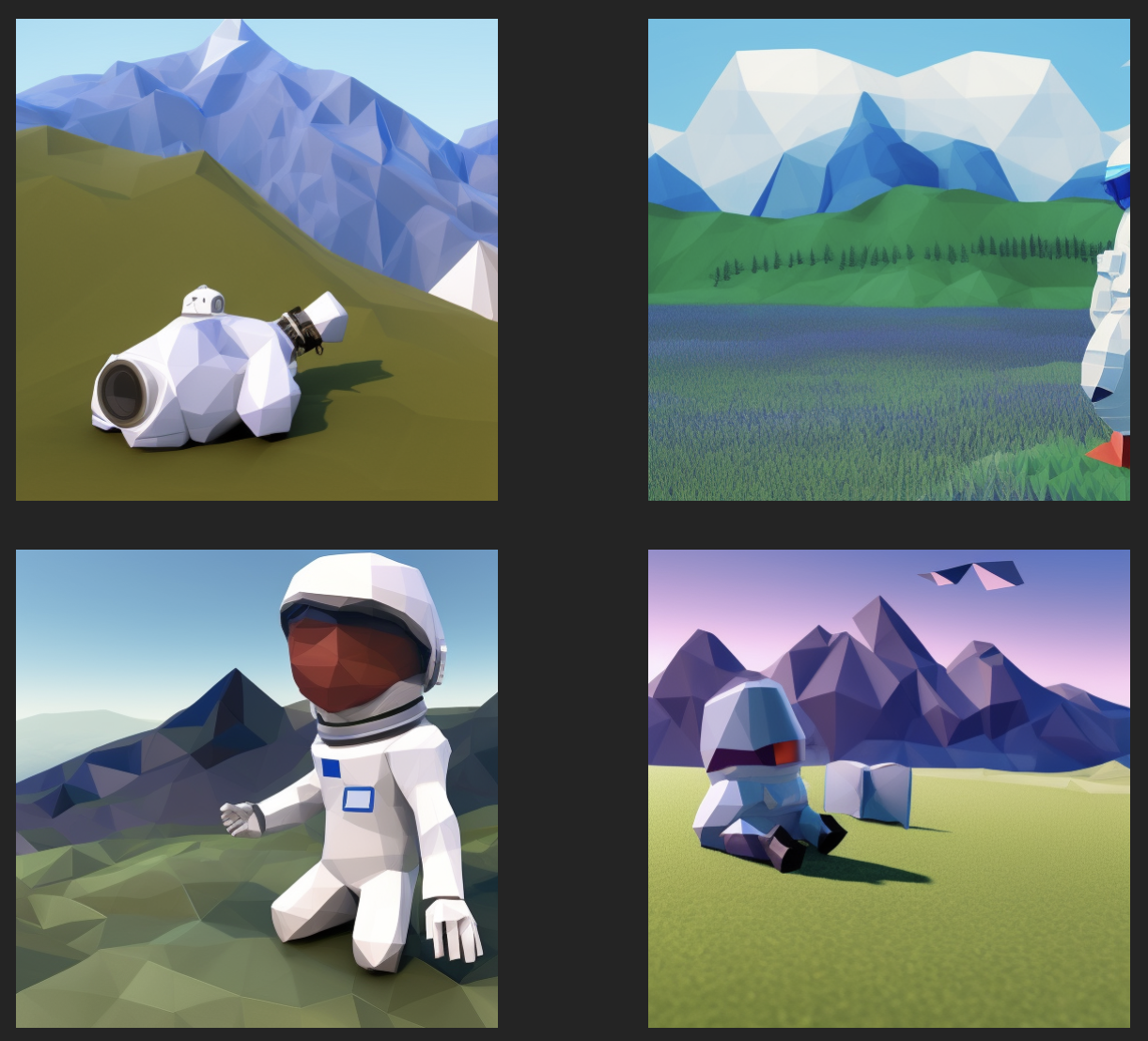 I did some more research on r/StableDiffusion and found people using the word isometric. I decided to try that out, using Stable Diffusion instead of DALLE. I also realized that I needed to add more modifiers to my prompt to constrain the style. I tried this prompt: A low poly world, with an astronaut in white suit and blue visor sitting in a sparse green meadow with low poly mountains in the background. Highly detailed, isometric, 4K