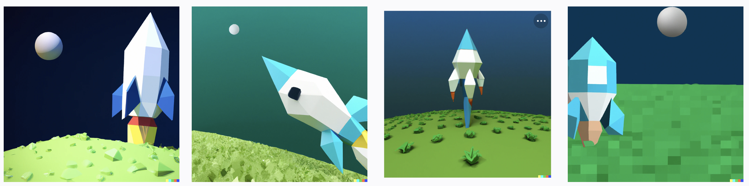 I decided to just start with DALLE and the prompt Low poly white and blue rocket shooting to the moon in front of a sparse green meadow and see what happened.