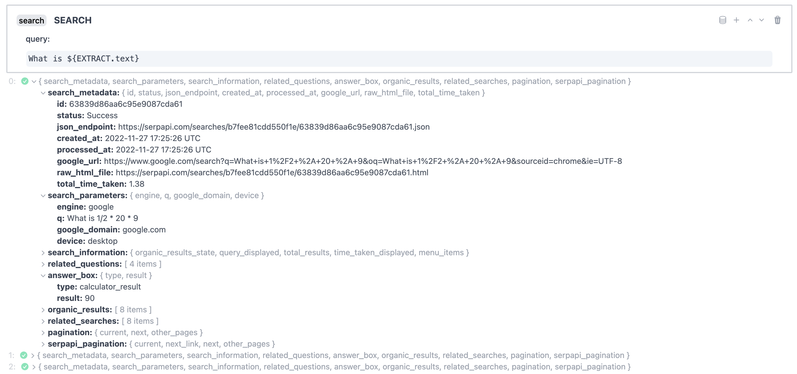 I have reproduced an example MRKL System from the original paper, using Dust.tt, linked here. The system reads a math problem (e.g. What is 20 times 5^6?), extracts the numbers and the operations, and reformats them for a calculator app (e.g. 20*5^6). It then sends the reformatted equation to Google's calculator app, and returns the result. Note that the original paper performs prompt tuning on the router (the LLM), but I do not in this example. Let's walk through how this works:
