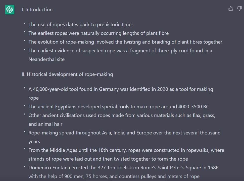 The following is ChatGPT’s outline on the Wikipedia page on “rope,” specifically on the history of rope.