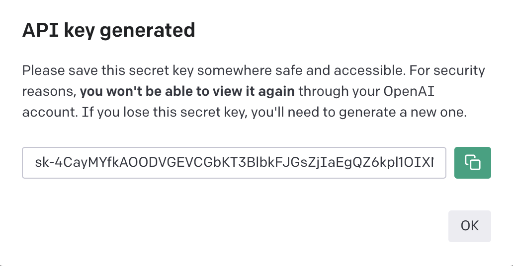 When you navigate to the OpenAI API key page, click the Create new secret key button. It will pop up a modal that contains a string of text like this: