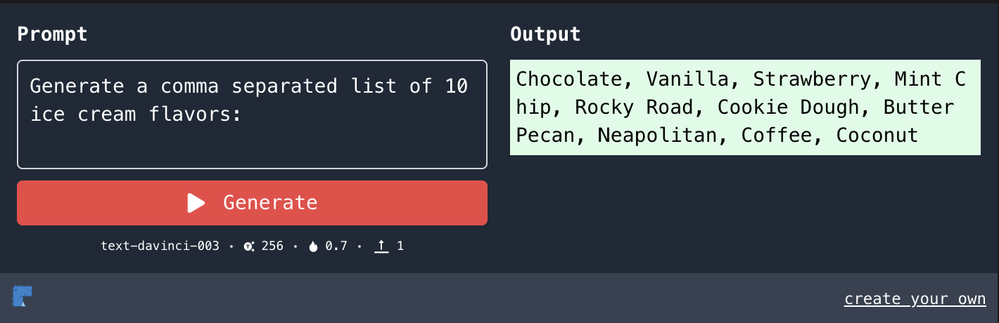 Assuming that you can see it, click on the Generate button. If this is your first time using it (or you are in a new browser/have cleared cookies), it will ask you to input an OpenAI API key. You can get a free key by clicking this link and signing up for an OpenAI account. This key allows you to use OpenAI's AIs to generate text in the Dyno embeds.