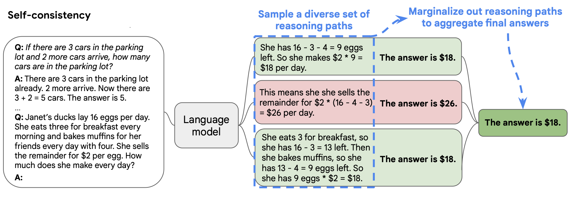 Self-consistency1 is a follow up to CoT that generates multiple chains of thought instead of just one, then takes the majority answer as the final answer.