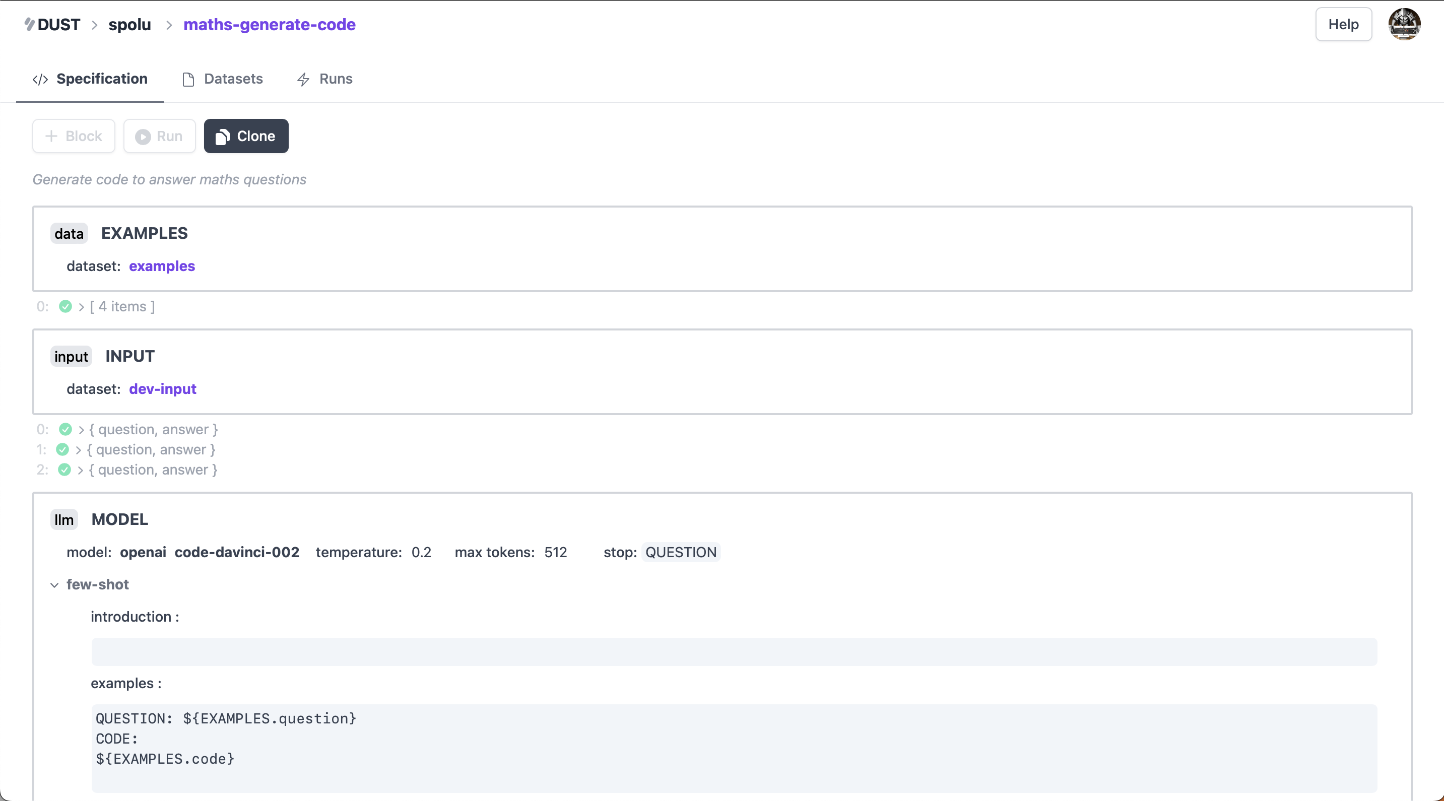 Dust provides robust tooling in the form of a number of composable "blocks", for functions like LLM querying, code snippets, and internet searches. Dust also supports the use of datasets and automatically testing prompts against datasets.