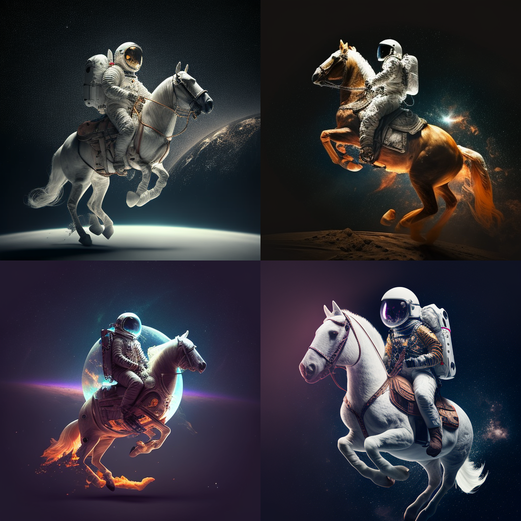 /imagine prompt: astronaut on a horse --ar 3:2 --c 70 --q 2 --seed 1000