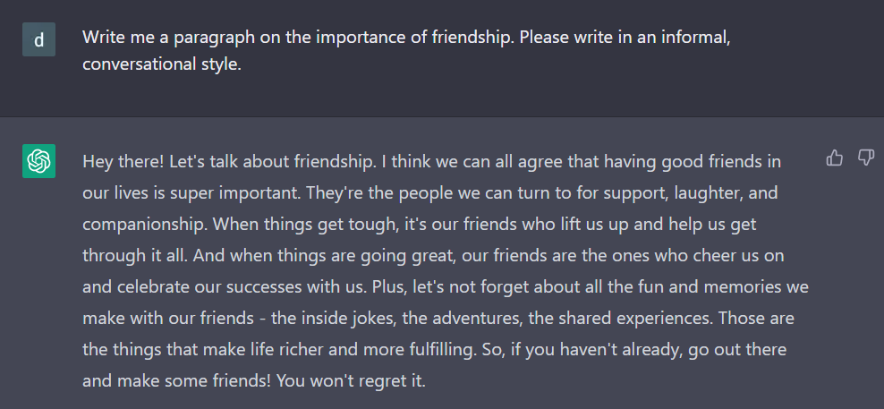 Las AIs como ChatGPT son conocidas por escribir ensayos y artículos de blog en un abrir y cerrar de ojos. Pero a menudo, los artículos que producen son genéricos y sin chispa. Necesitas hacer algo extra para darle un poco de espíritu o chispa a las palabras. Una de las formas más rápidas de lograrlo es especificar un estilo de escritura o mencionar el nombre de un autor famoso en la indicación. Digamos que quieres un párrafo sobre la importancia de la amistad. Una indicación genérica como "Escríbeme un párrafo sobre la importancia de la amistad" producirá una respuesta genérica por parte de ChatGPT.