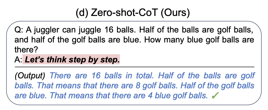 Kojima y su equipo experimentaron con una serie de diferentes comandos Zero-shot-CoT (por ejemplo, "Resolvamos este problema dividiéndolo en pasos" o "Pensemos en esto lógicamente"), pero descubrieron que "Pensemos paso a paso" es el más efectivo para sus tareas elegidas.
