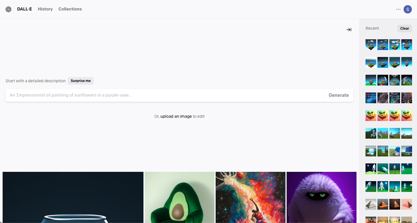 OpenAI DALLE IDE tiene una experiencia de usuario fluida y es fácil de usar. Tiene una vista de historial para ver las generaciones anteriores y una función de colecciones para organizar y compartir generaciones. También permite la edición y pintura de imágenes.