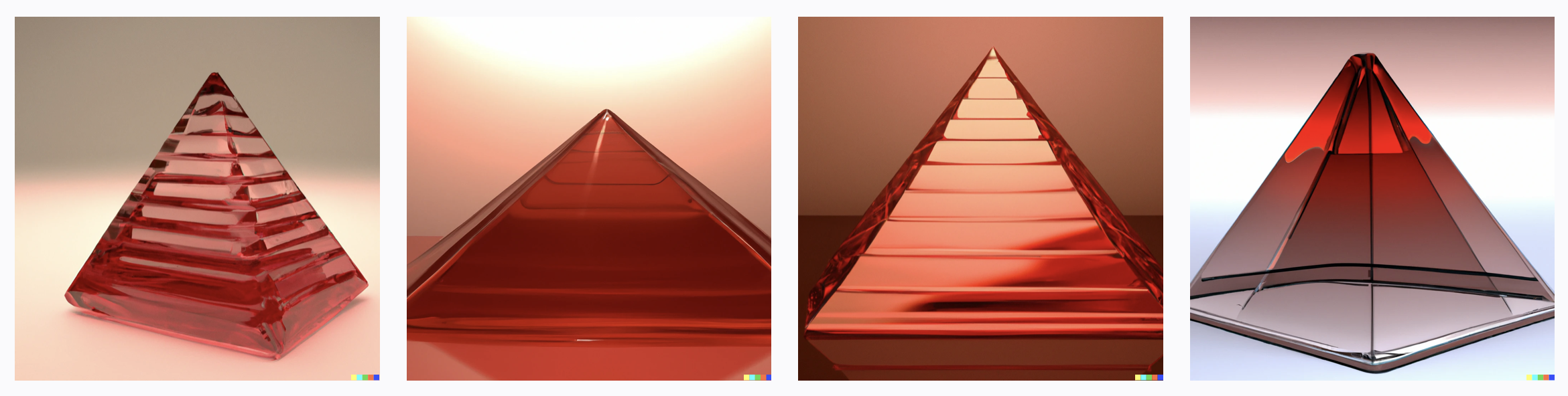 Here are a few pyramids generated by DALLE, with the prompt A pyramid made of glass, rendered in Unity and tinted red, which uses 3 style modifiers.