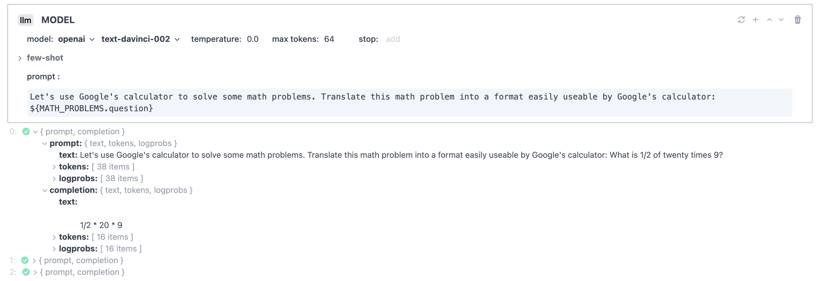 Next, I created a llm block that extracts the numbers and operations. Notice how in the prompt I told it we would be using Google's calculator. The model I use (GPT-3) likely has some knowledge of Google's calculator from pretraining.