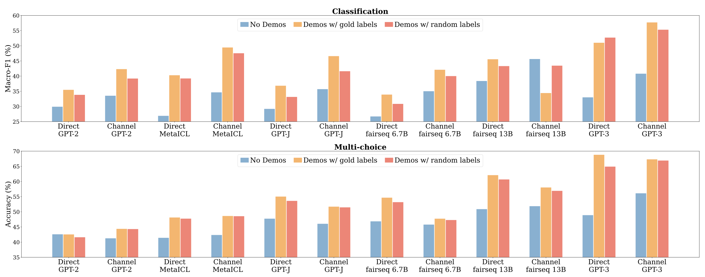Surprisingly, when providing few shot exemplars in prompts, the actual answers (gold) in the exemplars are not important. As shown in the figure below, providing random labels in the exemplars barely hurts performance1. "Demo" is synonymous with exemplar in this image.