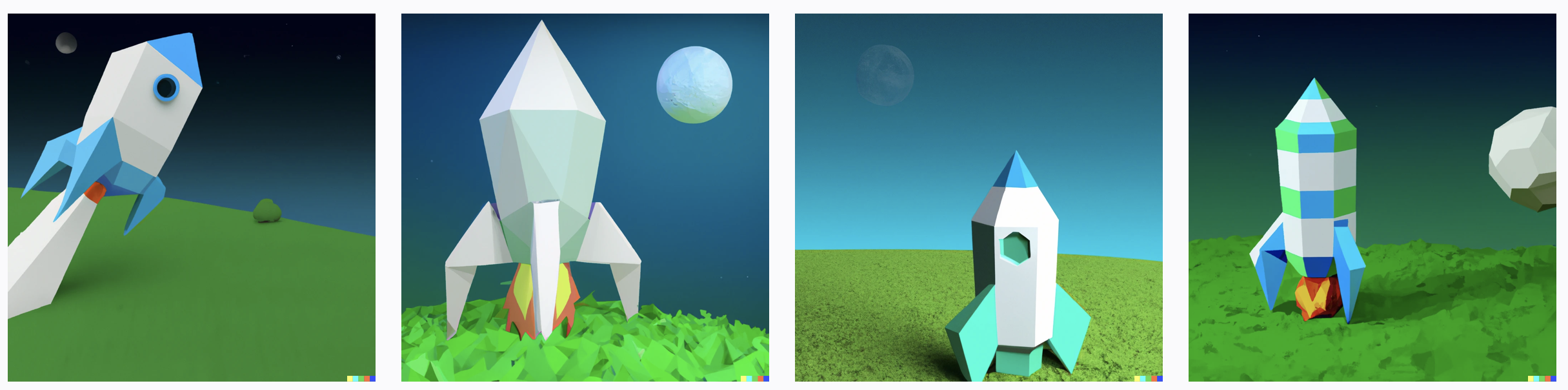 I decided to just start with DALLE and the prompt Low poly white and blue rocket shooting to the moon in front of a sparse green meadow and see what happened.