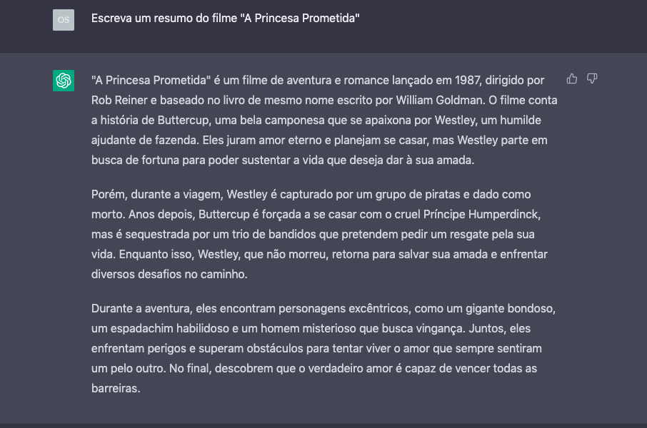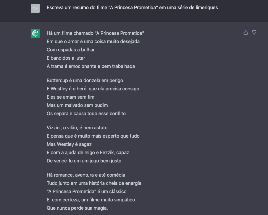 A reposta tem um tom moderadamente formal e dá alguns detalhes bem específicos! Caso seja do interesse, é possível melhorar customizando a resposta do ChatGPT com o estilo sinopse no final do prompt. Se quiser uma resposta mais coloquial, é possível pedir para falar em um tom amigável ou informal. Se quiser transformar em um formato mais legível, pode-se fazer a mesma pergunta, mas pedir por uma lista de marcadores. Ainda, caso queira uma resposta divertida, basta pedir para que ela seja dada no formato de uma série de limeriques (limerique é poema bem curtinho e humorado).