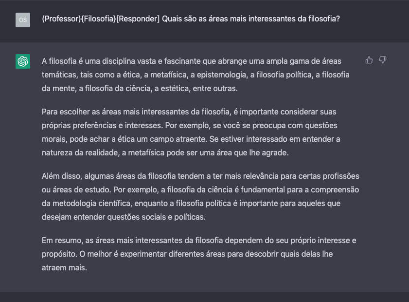No segundo exemplo, por outro lado, foi feita a pergunta depois de fornecer um estímulo prévio (priming) e a pergunta no formato correto ao ChatGPT. Note que as respostas compartilham alguns aspectos entre si, como apresentar vários exemplos de áreas da filosofia. Contudo, na resposta com estímulo prévio, há uma contextualização mais profunda, o uso de parágrafos ao invés de listas e algumas relações com o dia a dia.