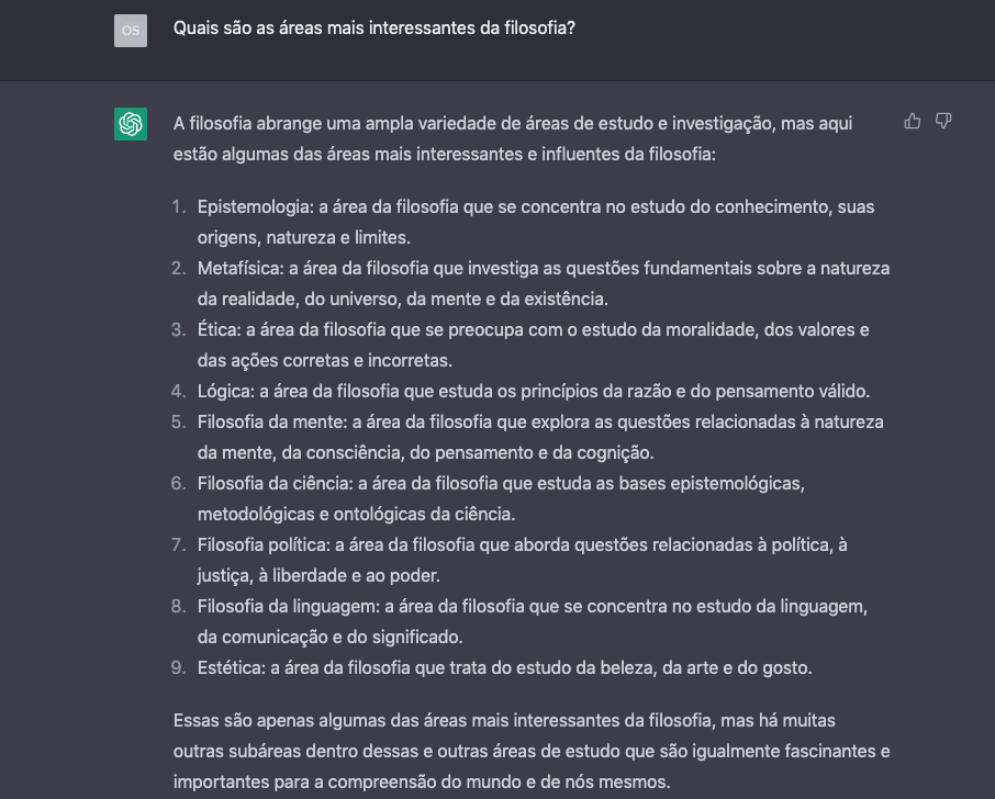 Abaixo, tem-se o exemplo de uma pergunta sem estímulo prévio (priming) ao ChatGPT sobre as áreas mais interessantes da filosofia. Usa-se uma lista, fala de forma generalista e sem paixão. Além disso, não é muito específico nas suas explicações.