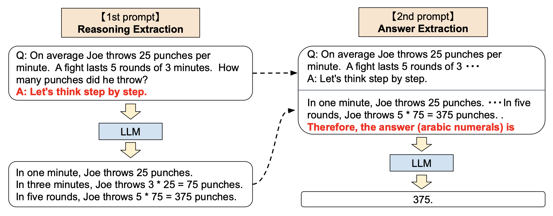 Technically, the full Zero-shot-CoT process involves two separate prompts/completions. In the below image, the top bubble on the left generates a chain of thought, while the top bubble on the right takes in the output from the first prompt (including the first prompt itself), and extracts the answer from the chain of thought. This second prompt is a self augmented prompt.