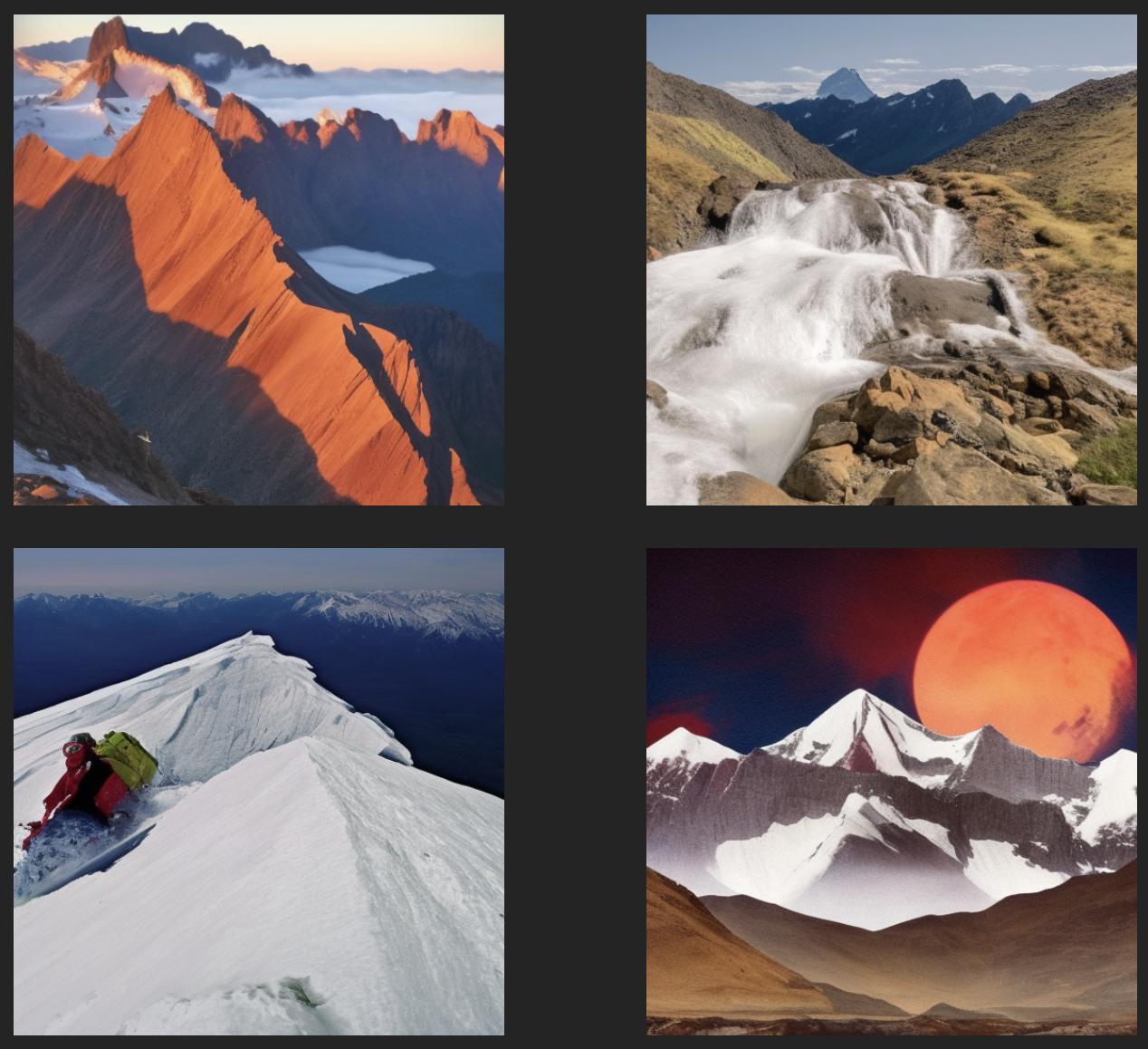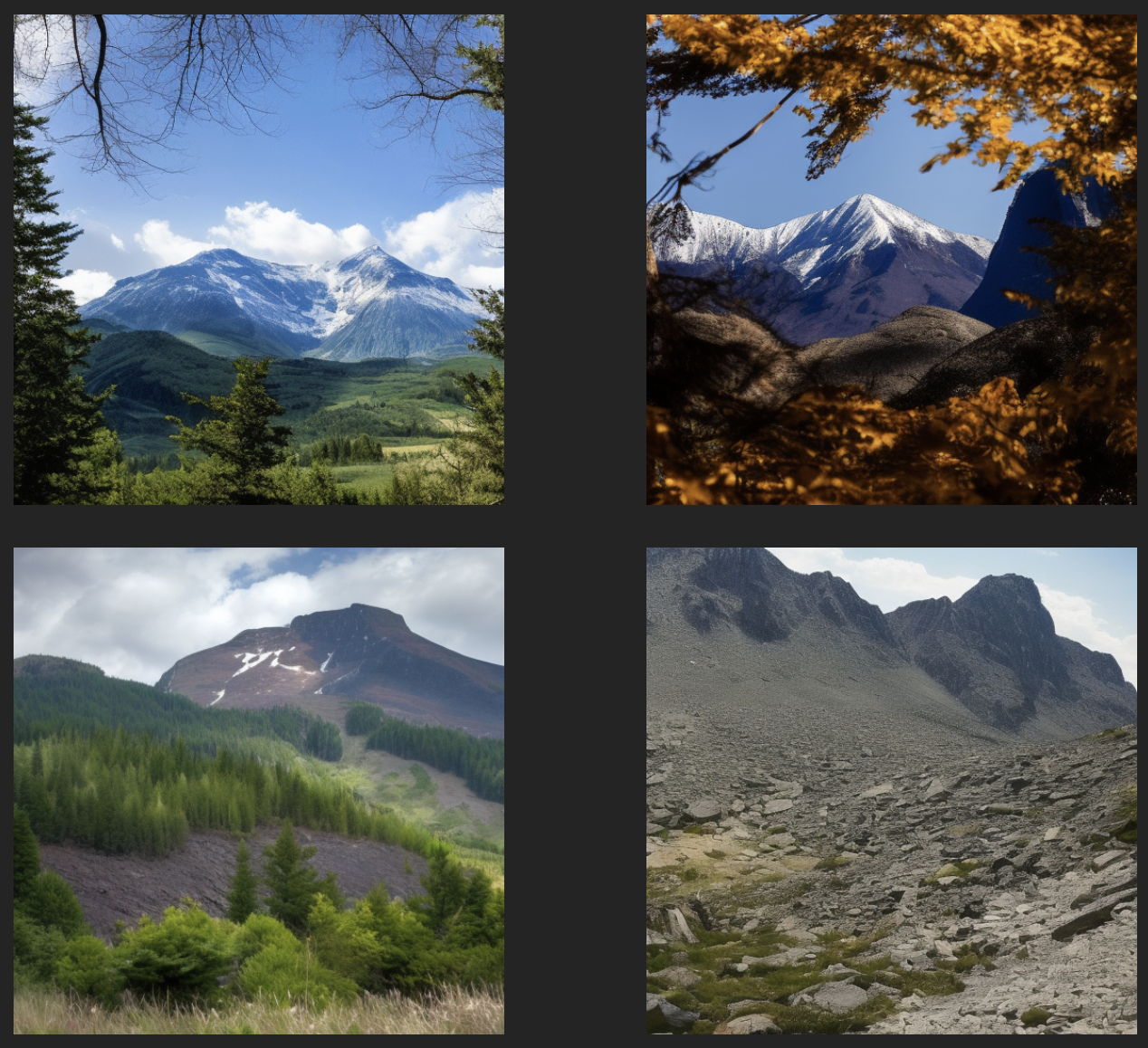 Here are a few mountains generated by Stable Diffusion, with the prompt mountain.
